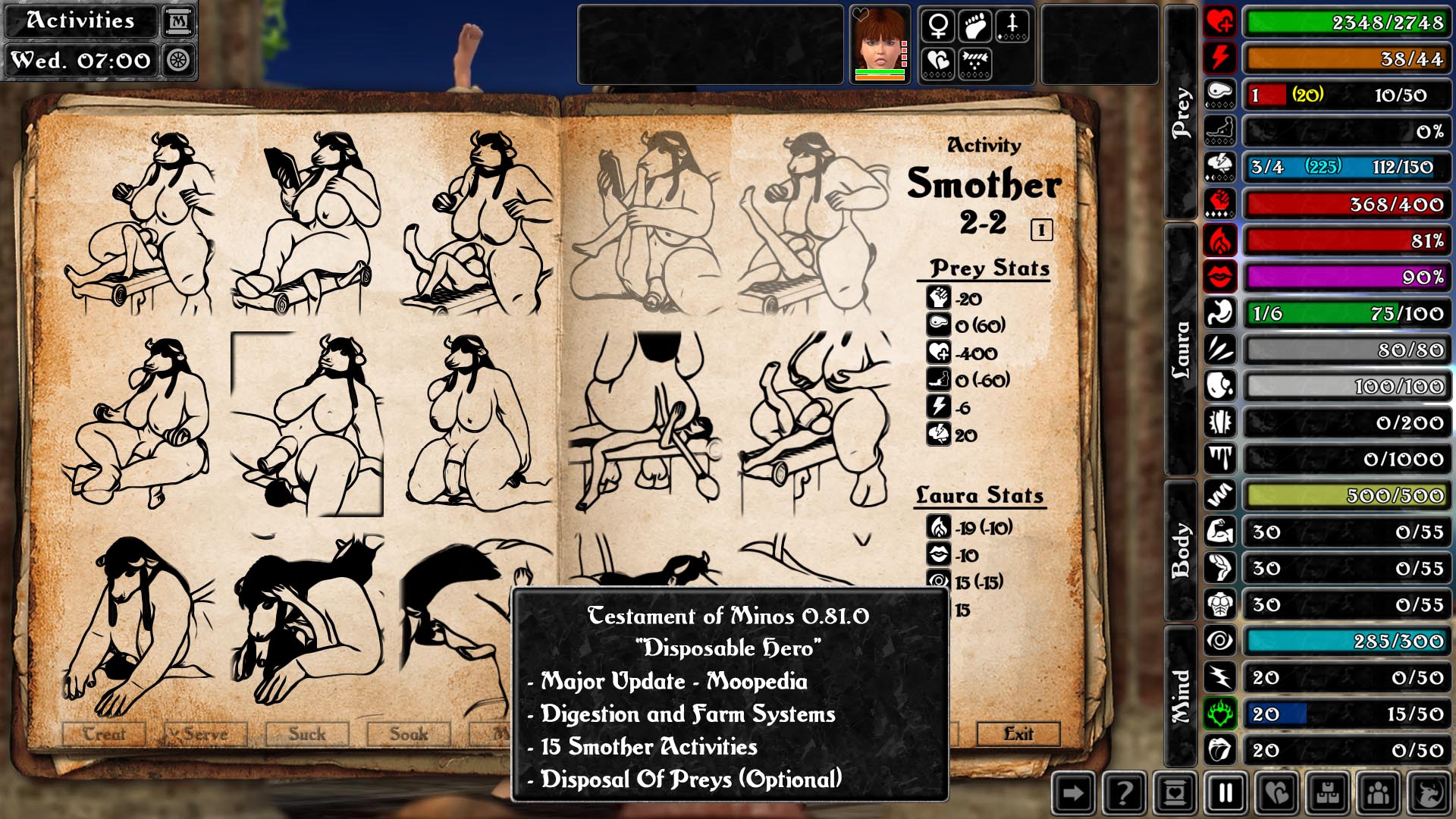- New: Disposal - Laura can use her prey as a toilet (no dirty visuals) or as a fertilizer on her farm (simple-optional)